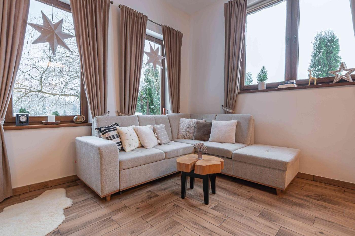 Apartament z 2 sypialniami. This spacious apartment features 1 living room, 2 separate bedrooms and 1 bathroom with a shower and free toiletries. Guests will find a stovetop, a refrigerator, kitchenware and a microwave in the kitchen. The apartment also comes with a barbecue. The apartment has parquet floors, a seating area with a flat-screen TV, a tea and coffee maker, a dining area as well as garden views. The unit has 4 beds. Apartament - 4 osobowy. Powierzchnia pokoju ok.: 70 mkw.