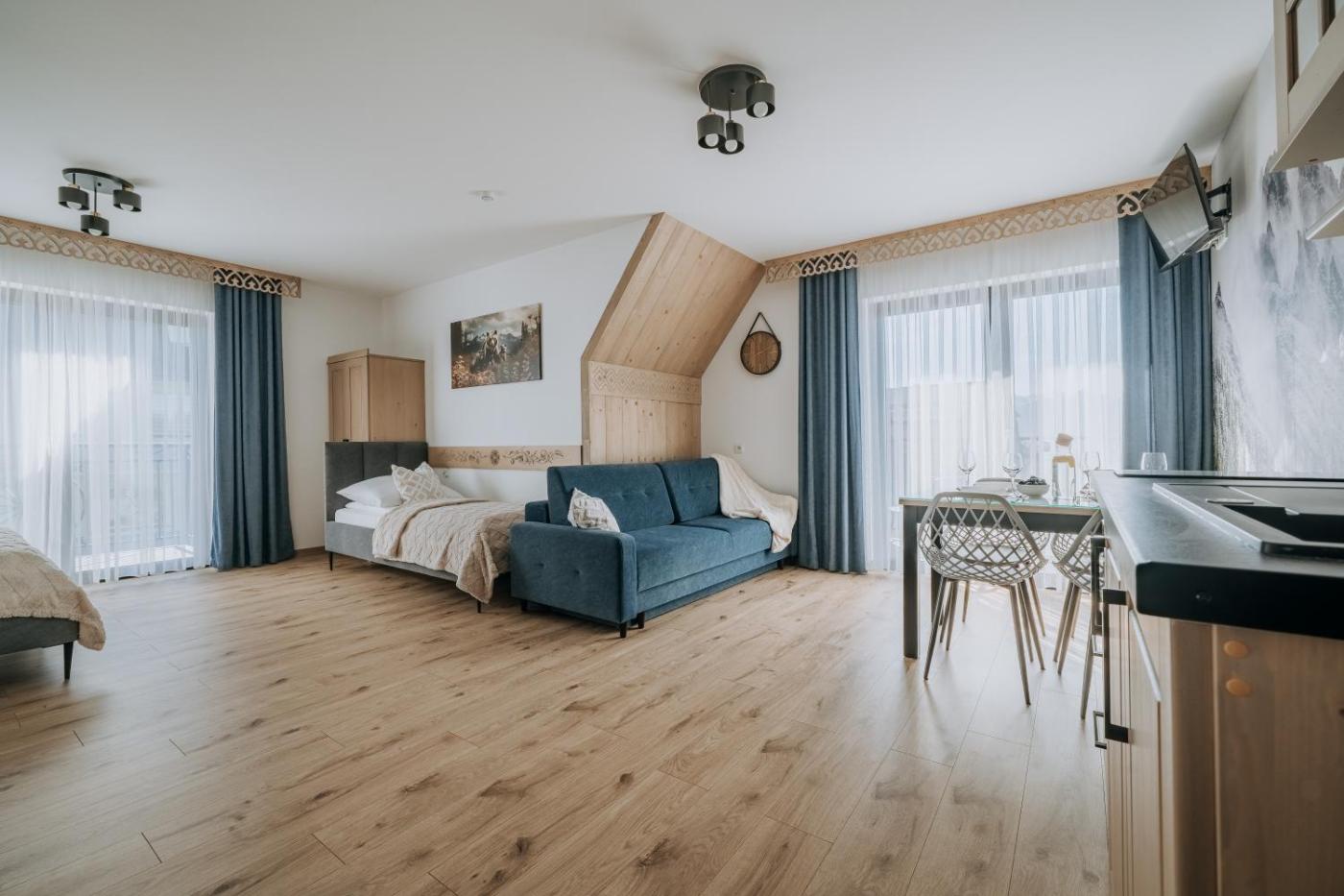 Studio z widokiem na góry. In the well-fitted kitchen, guests will find a stovetop, a refrigerator, kitchenware and a microwave. This studio is comprised of a flat-screen TV with satellite channels, a private bathroom as well as a balcony with mountain views. Studio - 5 osobowy. Powierzchnia pokoju ok.: 37 mkw. ;