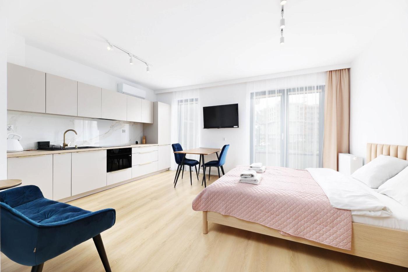 Studio. The well-fitted kitchen features a stovetop, a refrigerator, a dishwasher and kitchenware. The studio offers air conditioning, a washing machine, a balcony with ancourtyard view as well as a private bathroom featuring a shower. The unit offers 1 bed. Studio - 2 osobowy. Powierzchnia pokoju ok.: 29 mkw.