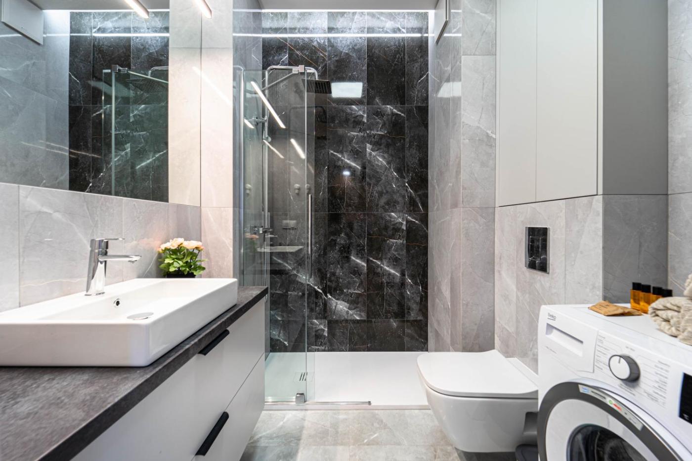 Studio z balkonem. Providing free toiletries, this studio includes a private bathroom with a shower and a hairdryer. The well-fitted kitchenette features a stovetop, a refrigerator, a dishwasher and kitchenware. This air-conditioned studio comprises a dining area, a flat-screen TV with streaming services a washing machine and a balcony. The unit offers 1 bed. Studio - 2 osobowy. Powierzchnia pokoju ok.: 27 mkw.